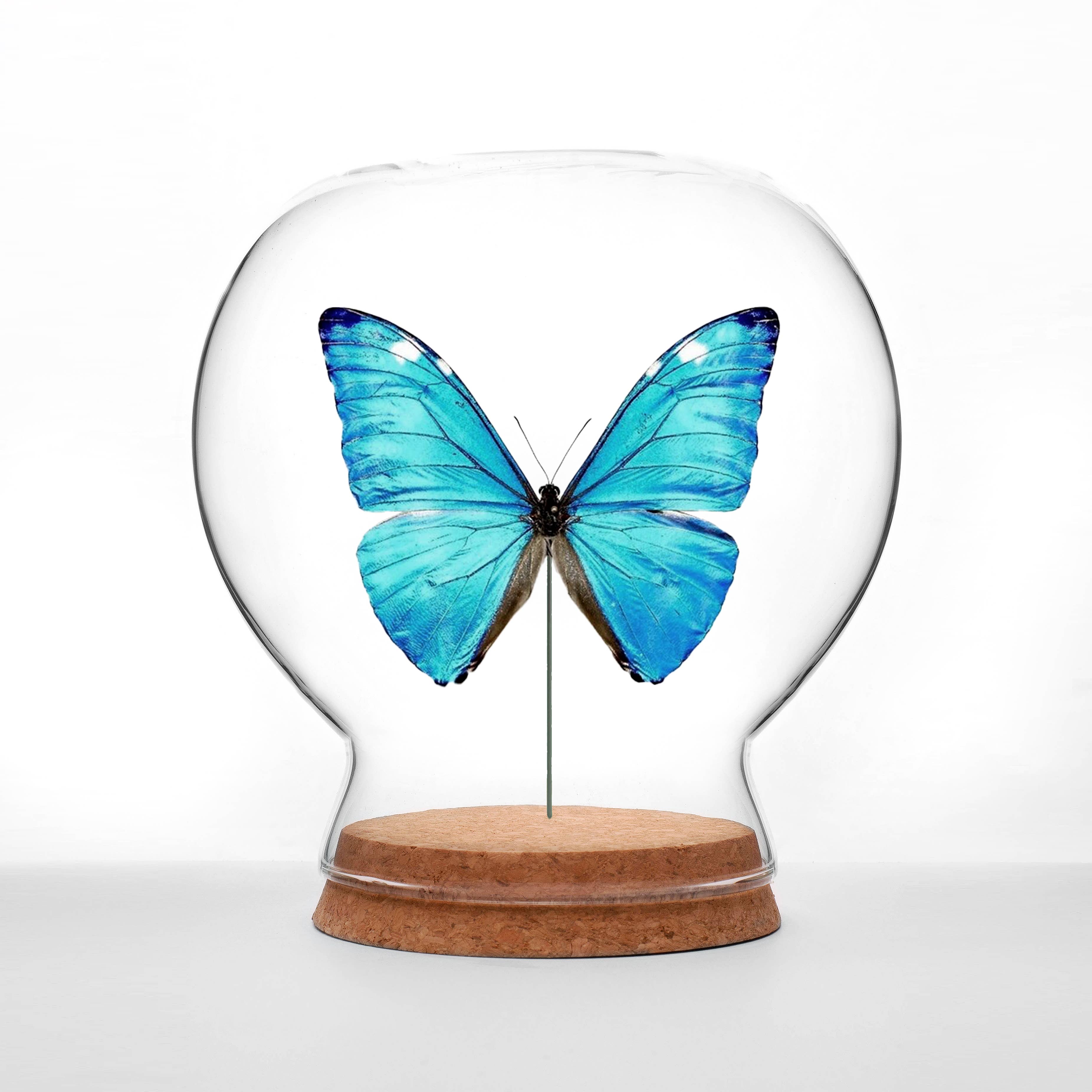 Discover the magic of nature's most dazzling flyer! Our Shiny Blue Morpho Butterfly Globe showcases this iridescent beauty in all its glory—ethically sourced and artfully arranged within a stunning glass dome. Each specimen is hand-positioned and naturally preserved, offering a complete panoramic view from every angle.