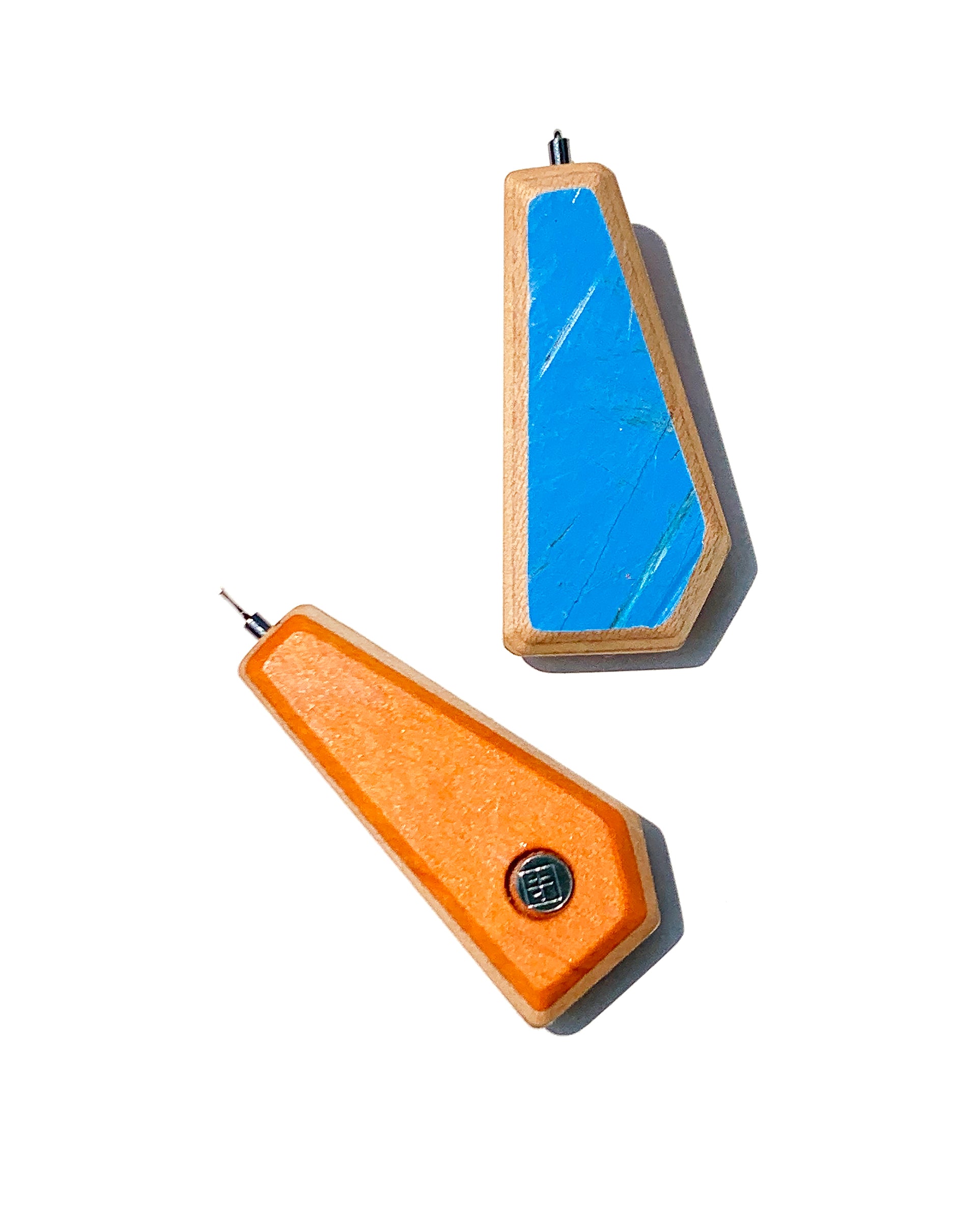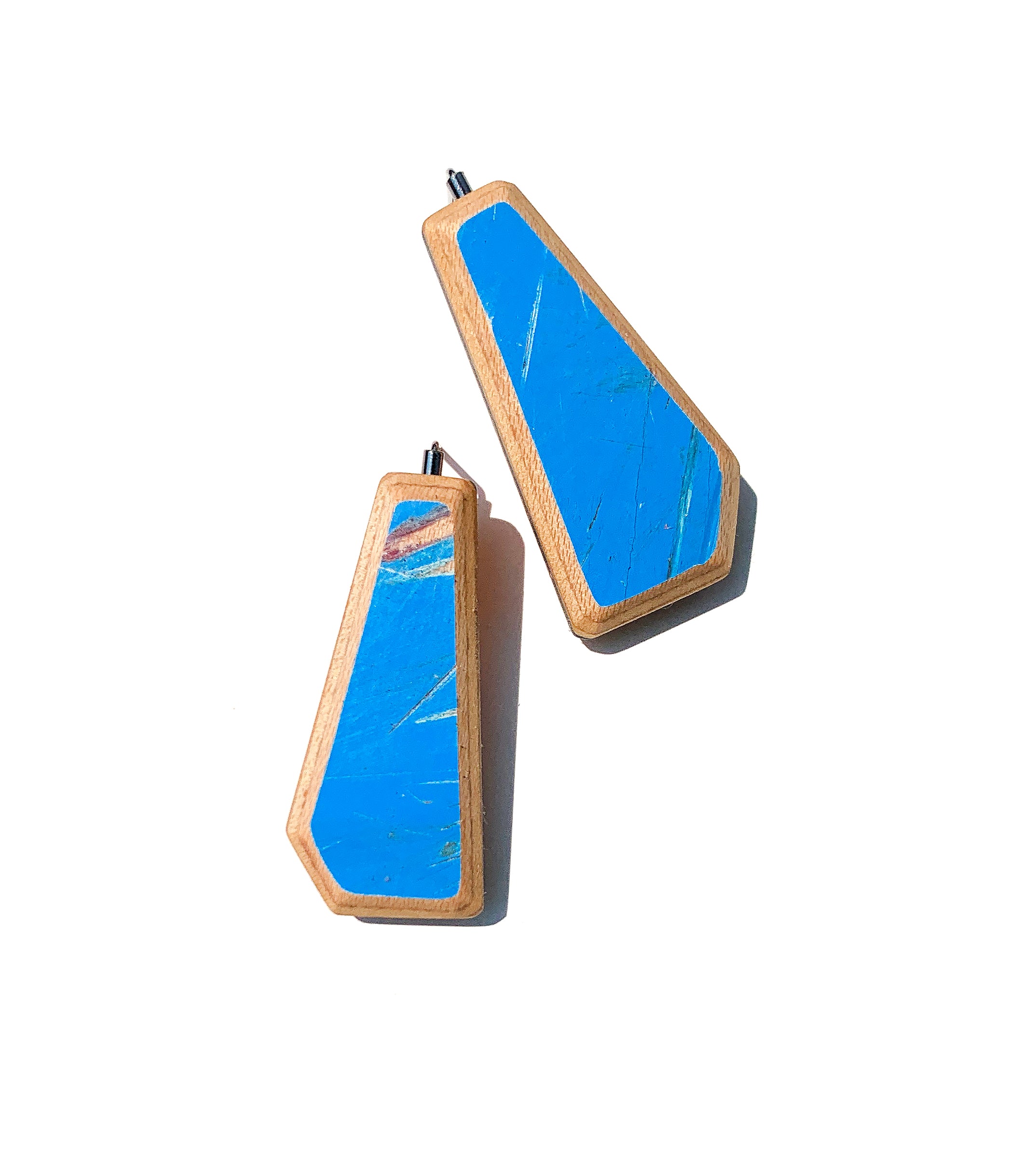 The wood comes from recycled skateboard decks, each piece lovingly hand-sanded and finished with linseed oil to keep that rich maple warmth intact. Topped with sterling silver and stainless steel posts.