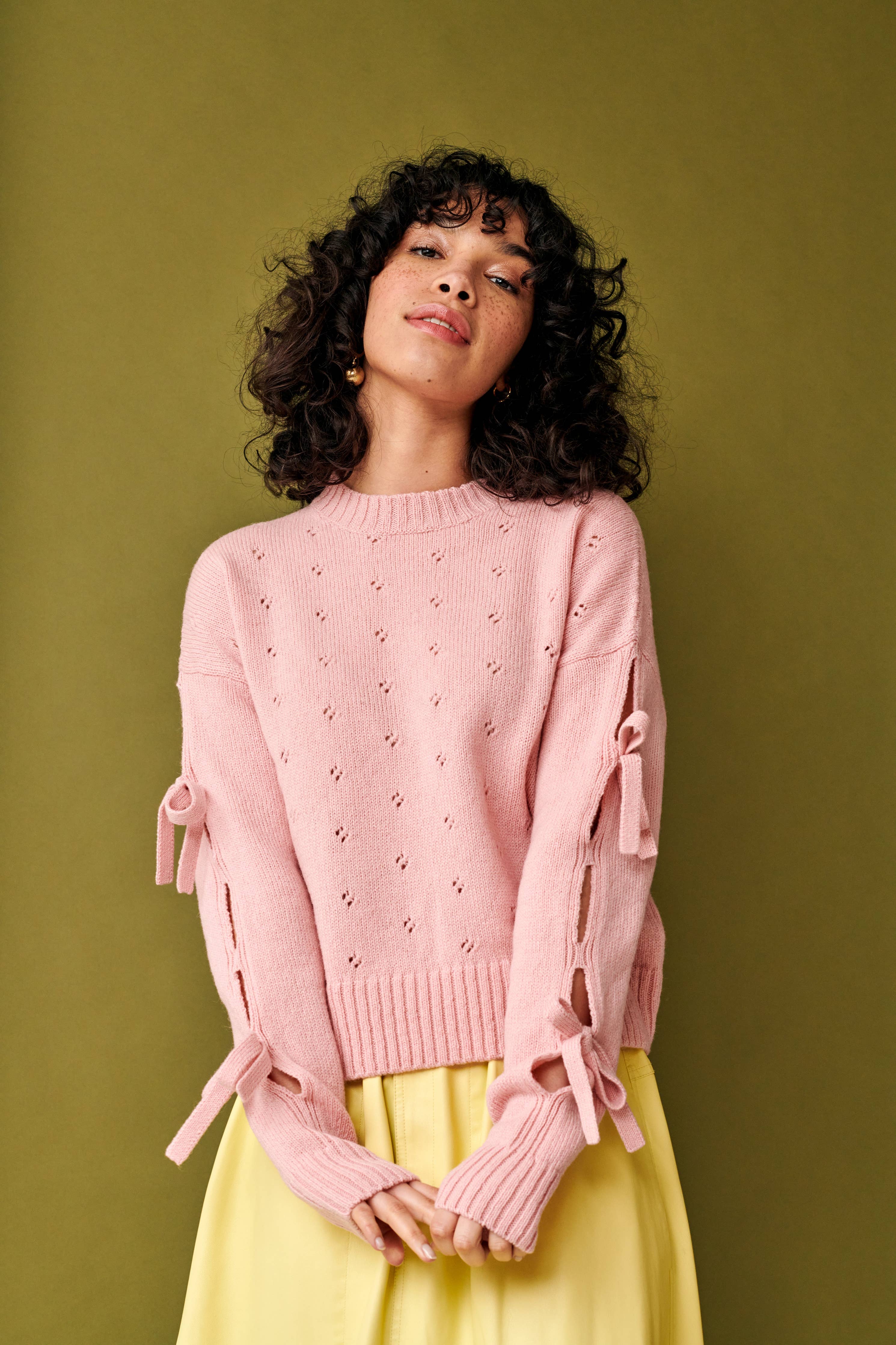 Step into pure romance with this light pink sweater that's all about delightful details. Self-tying bows dance playfully down each sleeve, while an airy, textured knit adds that perfect touch of whimsy. It's the kind of piece that makes you smile every time you put it on.