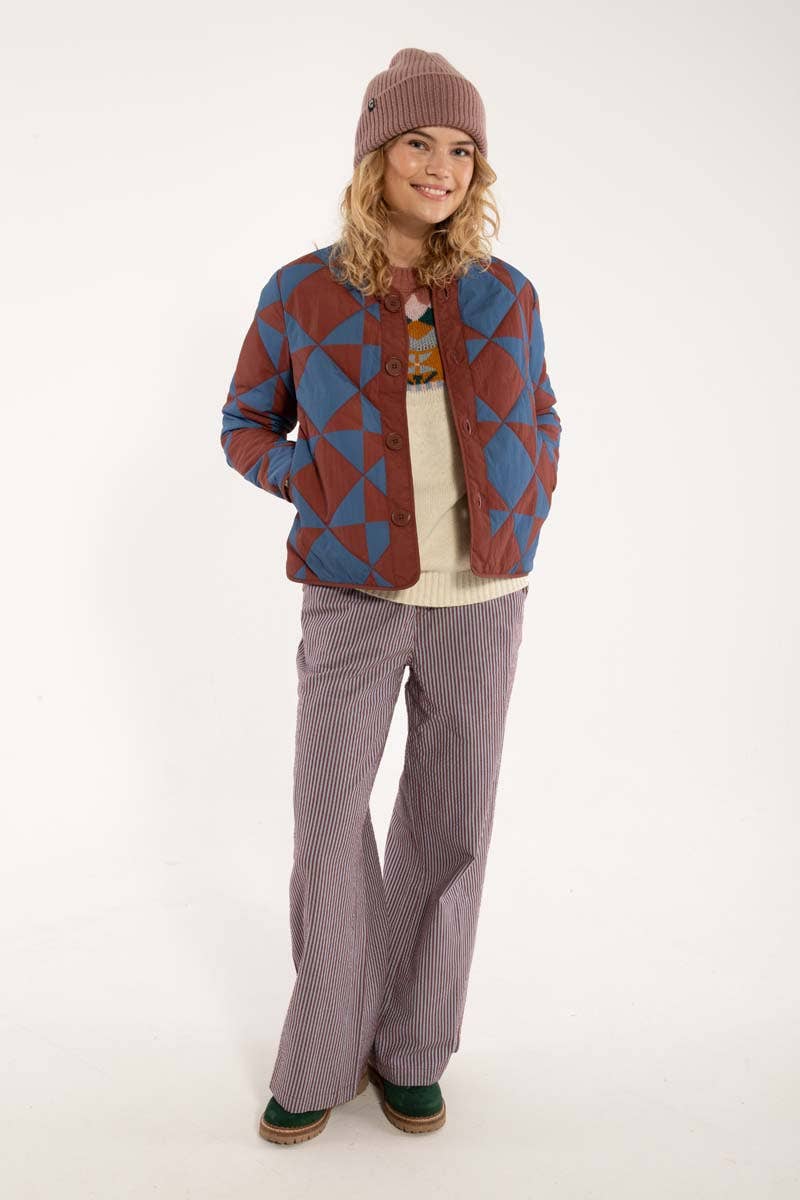 This stunning thermal jacket in dark brick and warm blue combines timeless style with serious versatility. The eye-catching quilted design adds texture and visual interest, while the thoughtful construction delivers comfort whether you're wearing it solo on mild days or layering it for extra warmth when temperatures drop. Pair it with sneakers for casual vibes or boots for a polished finish.
