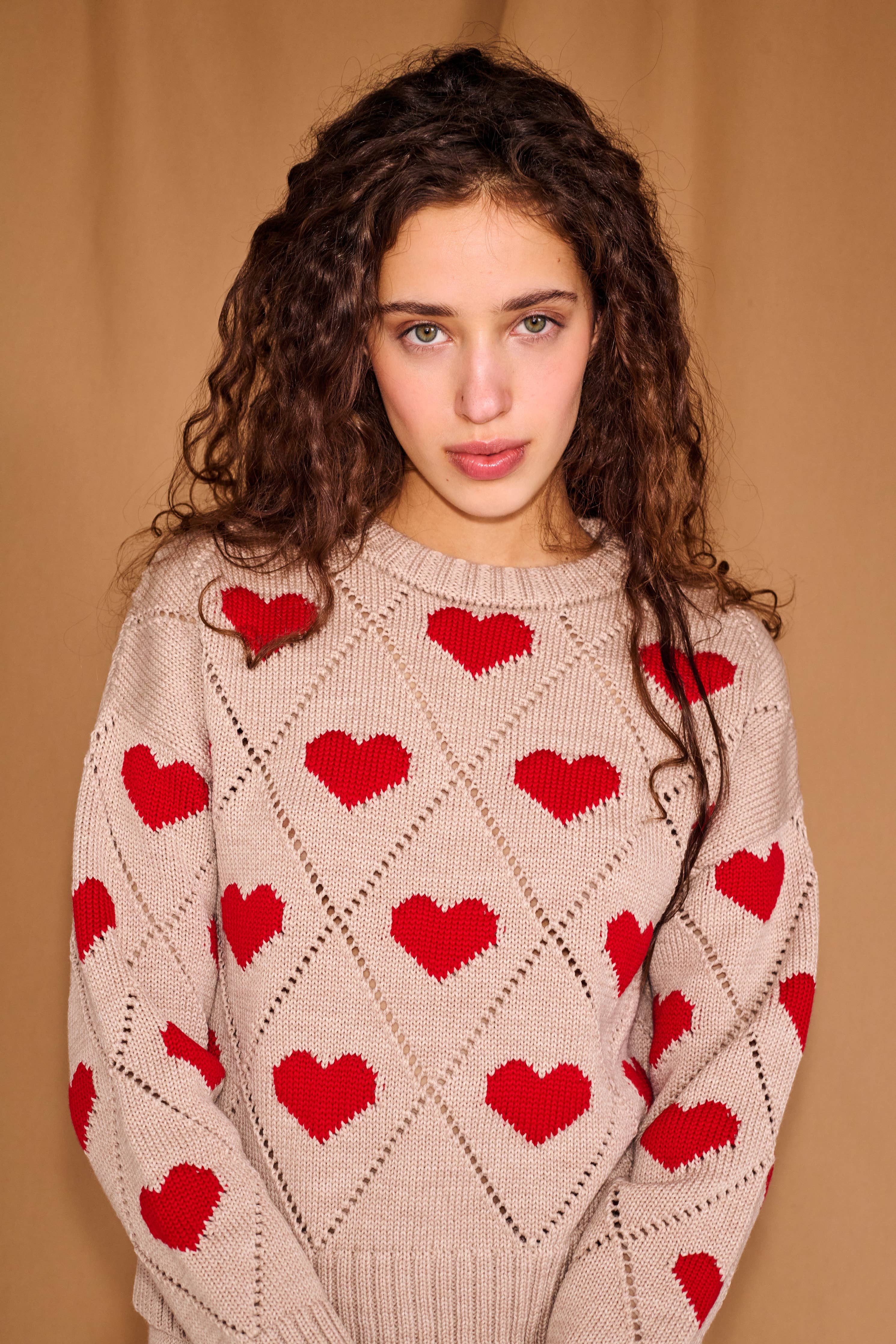 Embrace your romantic side in this charming beige sweater, where playful red hearts dance across the front in intricate intarsia designs, surrounded by delicate diamond motifs and airy eyelet accents. The medium-weight knit feels wonderfully soft and breathable against your skin, while the relaxed, boxy cut with a subtle crop keeps things modern and effortless. Whether you're channeling cozy-chic vibes or adding a flirty pop to your everyday look, this sweater brings instant personality to any outfit.