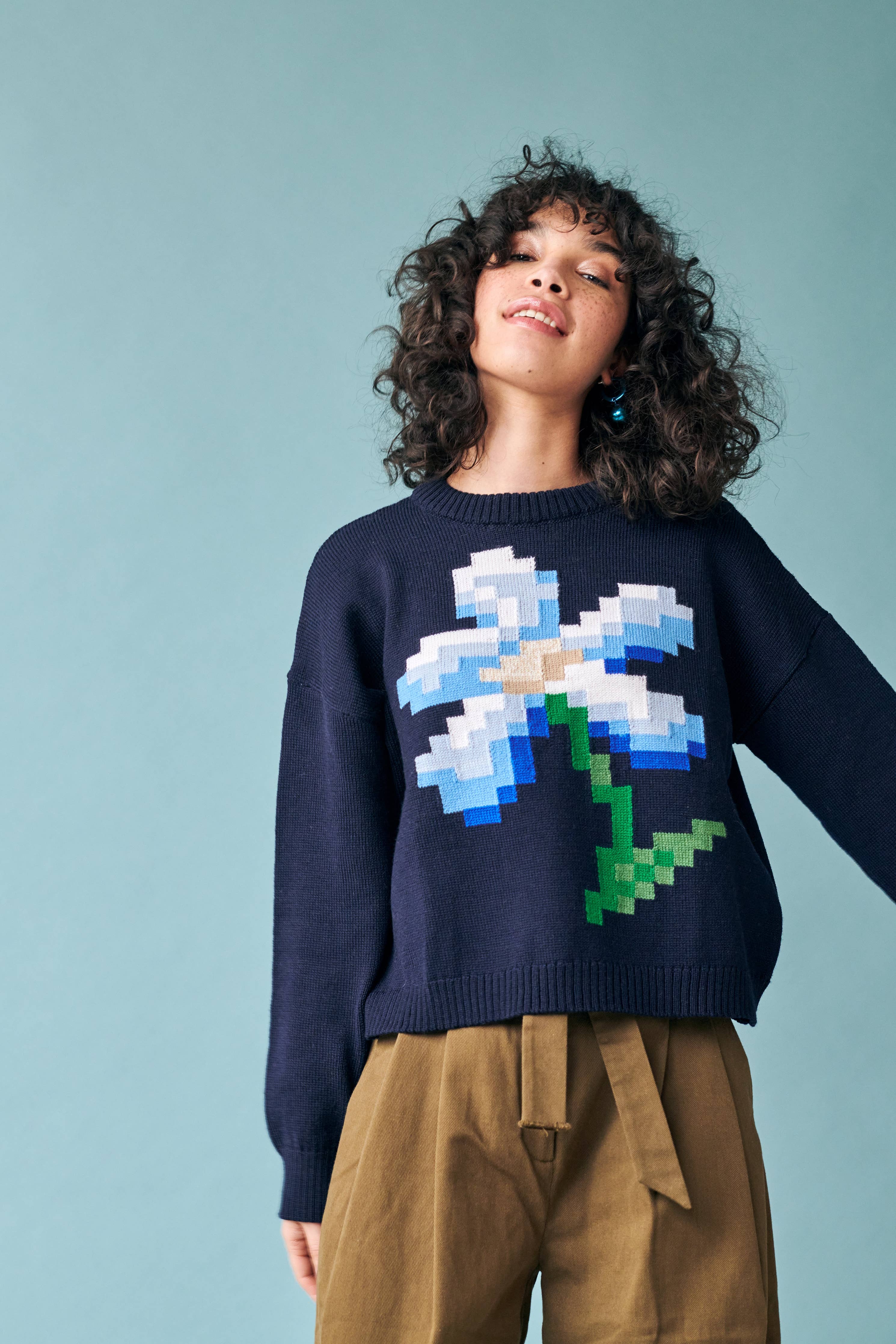 This navy sweater brings springtime vibes to winter days with its charming pixelated daisy motif—a playful nod to digital-age style. Knitted from luxuriously soft fine Merino wool, it keeps you cozy without bulk, while the relaxed drop-shoulder cut and boxy silhouette let you move freely. Slip it on whenever you crave a cheerful botanical escape from the cold.