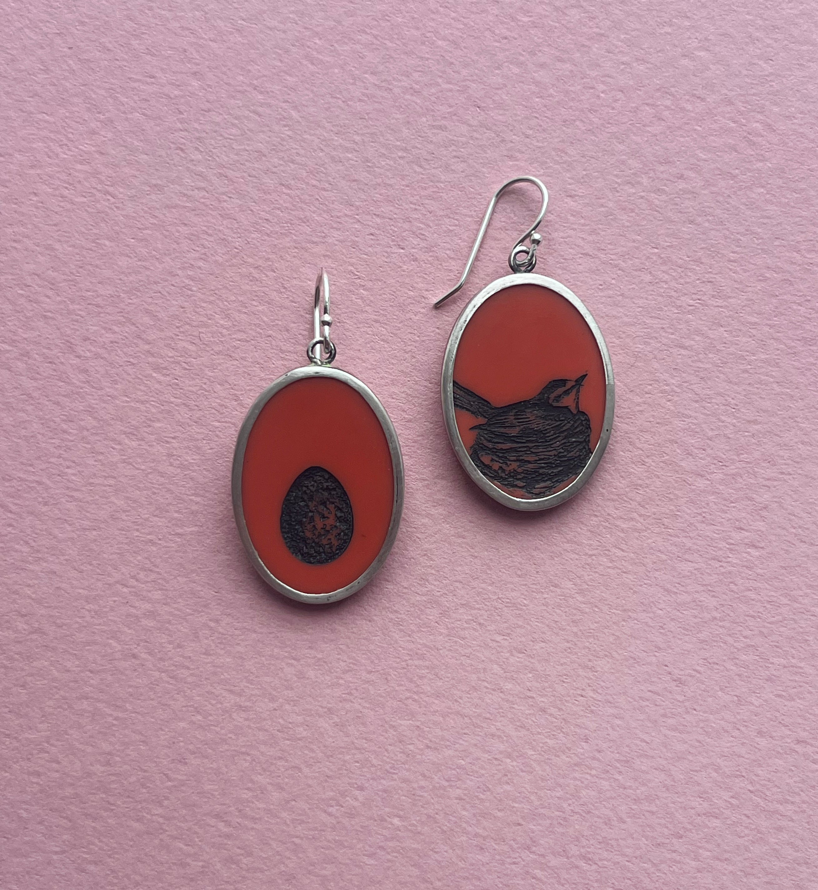 Sterling silver earrings featuring a whimsical robin perched beside a delicate egg, with charming etched coral details.