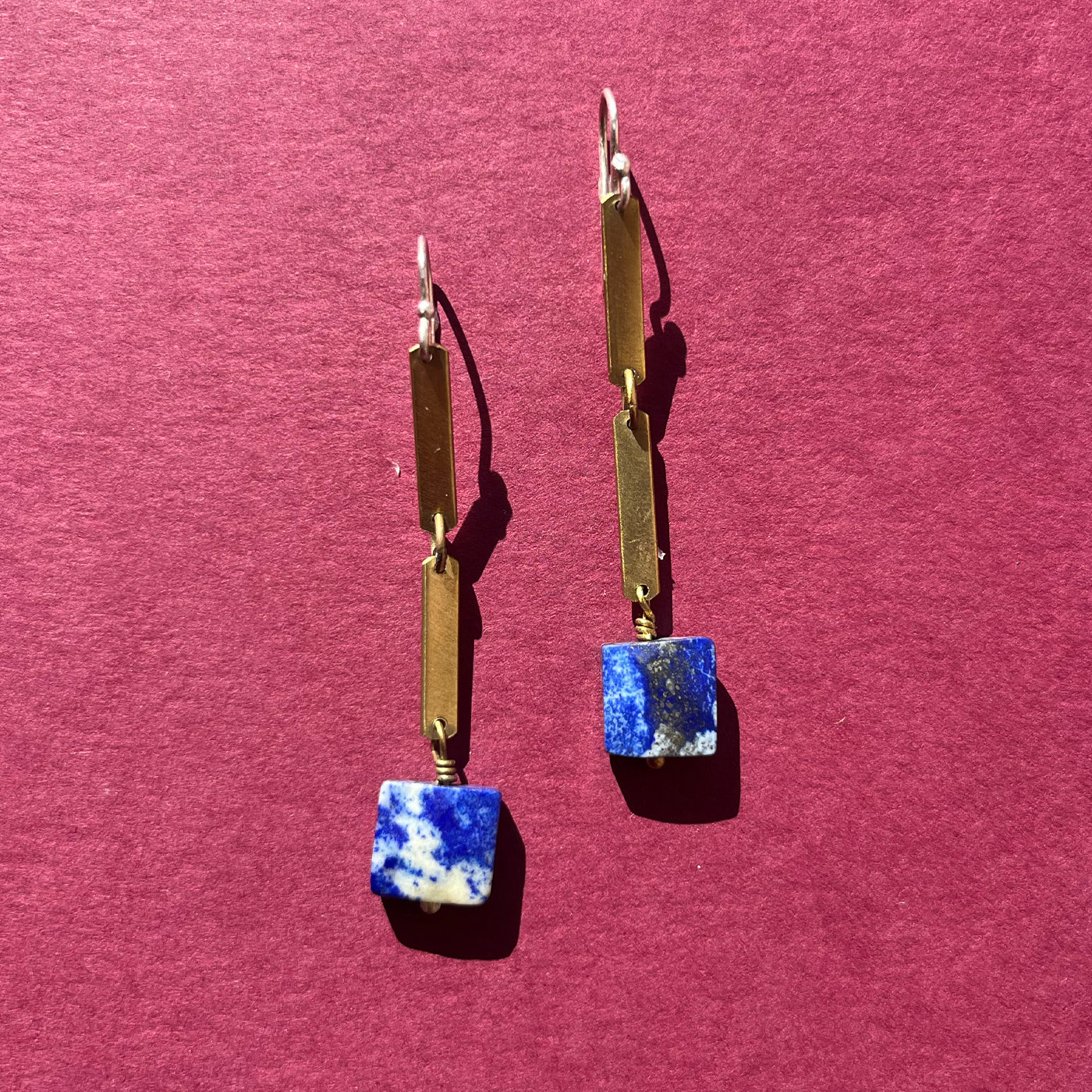 These earrings feature long brass links paired with vibrant blue lapis stones, all hanging from sterling silver earwires for a fun and stylish look.