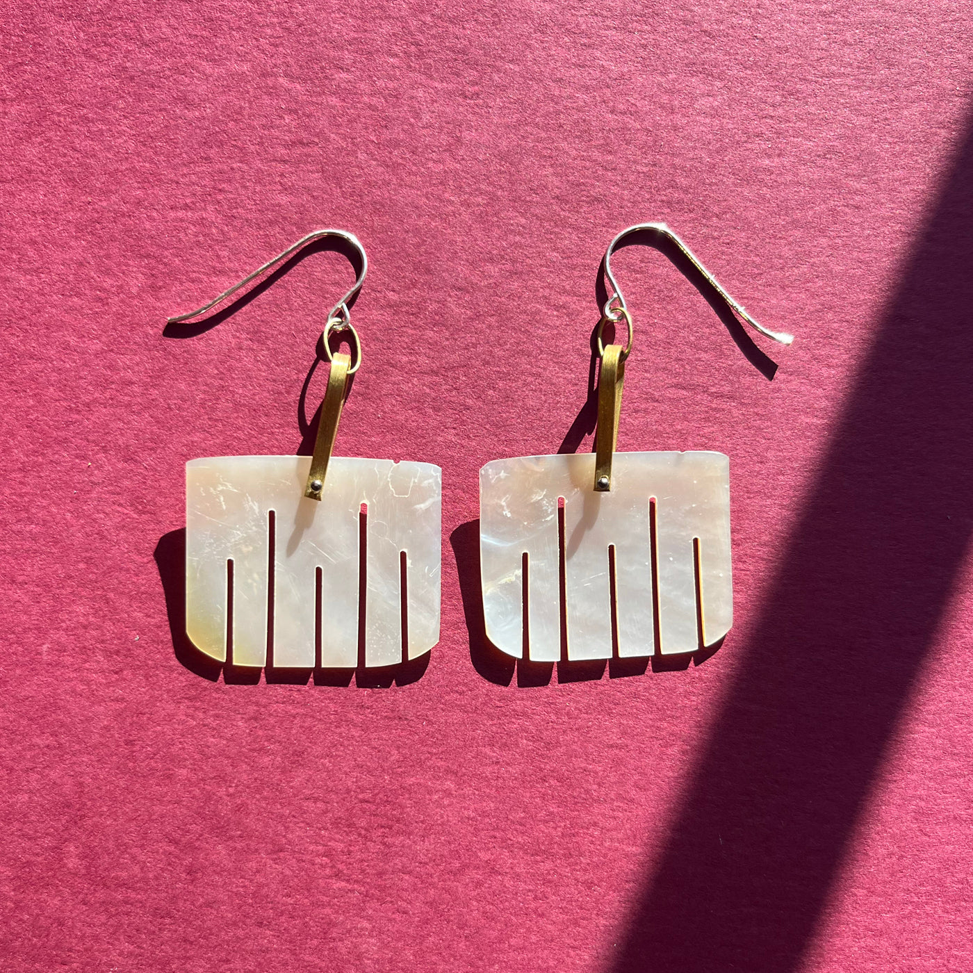 Delightful hand-cut mother of pearl paired with brass, finished with sterling silver hooks for a charming, playful touch.