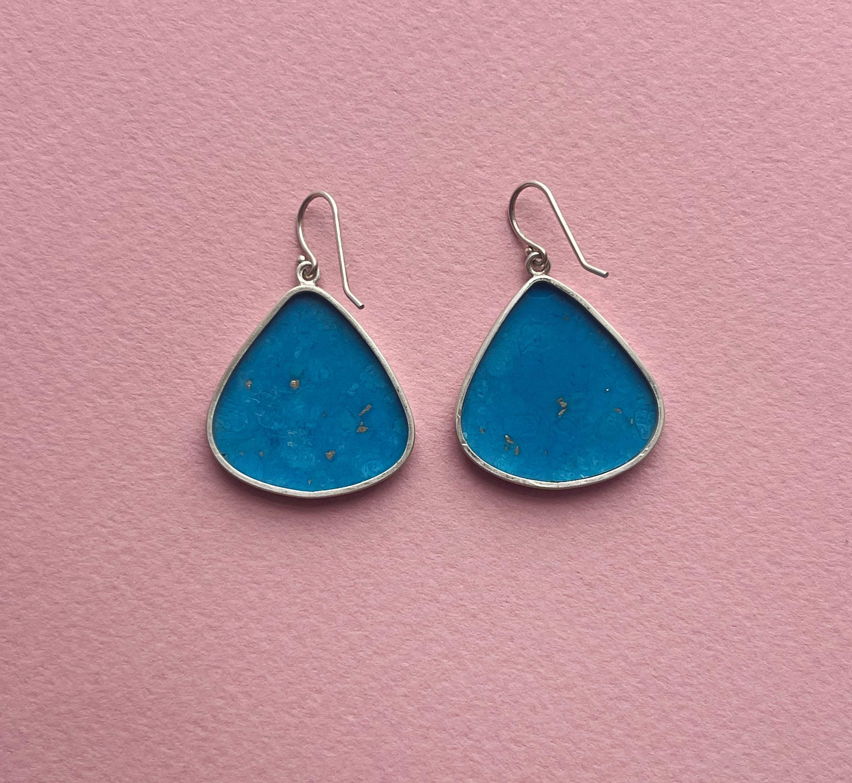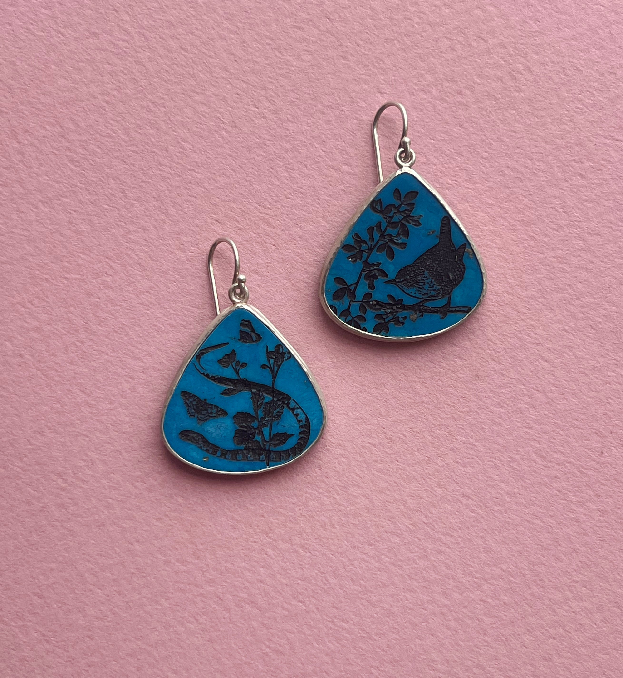 Handcrafted turquoise earrings featuring an enchanting serpent and bird duo, adorned with delicate floral etching. These whimsical pieces blend nature-inspired artistry with vibrant gemstone beauty, perfect for adding a touch of mystical charm to any look.