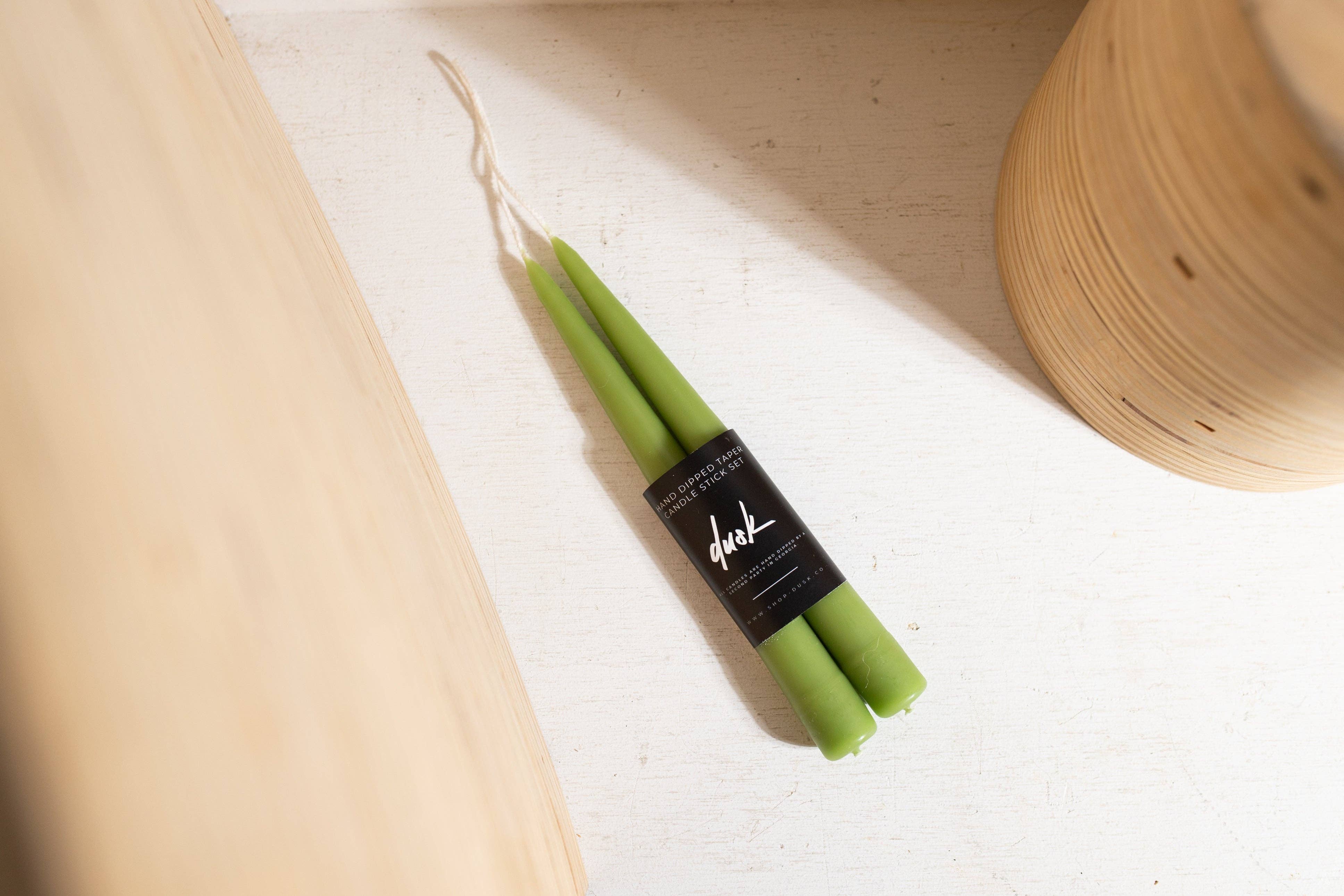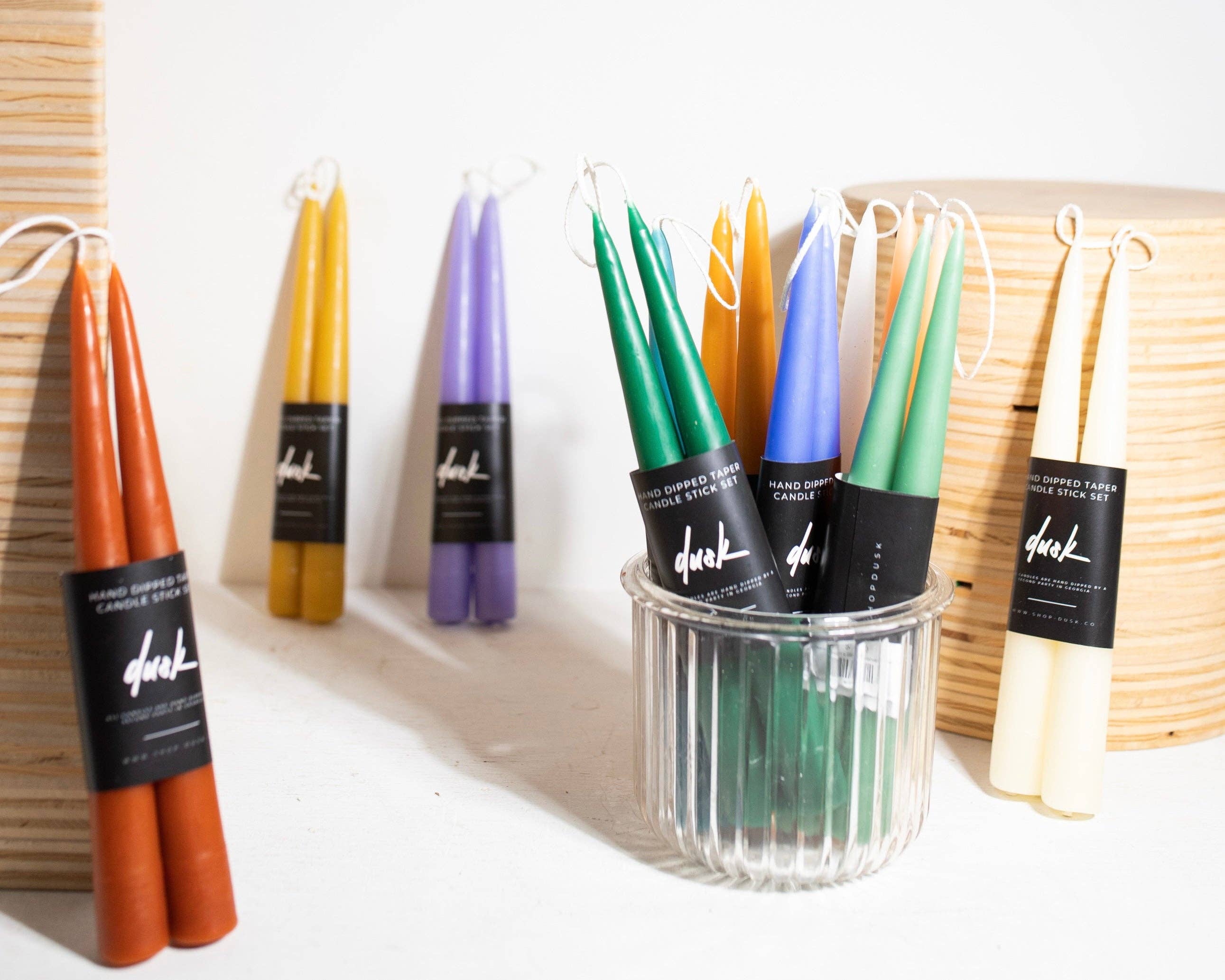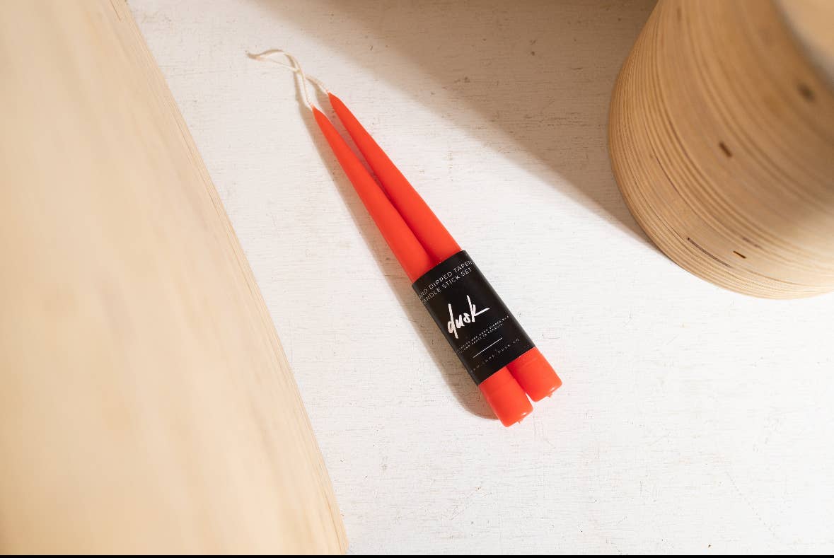A delightfully quirky pair of hand-dipped taper candles, each stretching a full 9 inches tall and charmingly tethered together by a single shared wick.