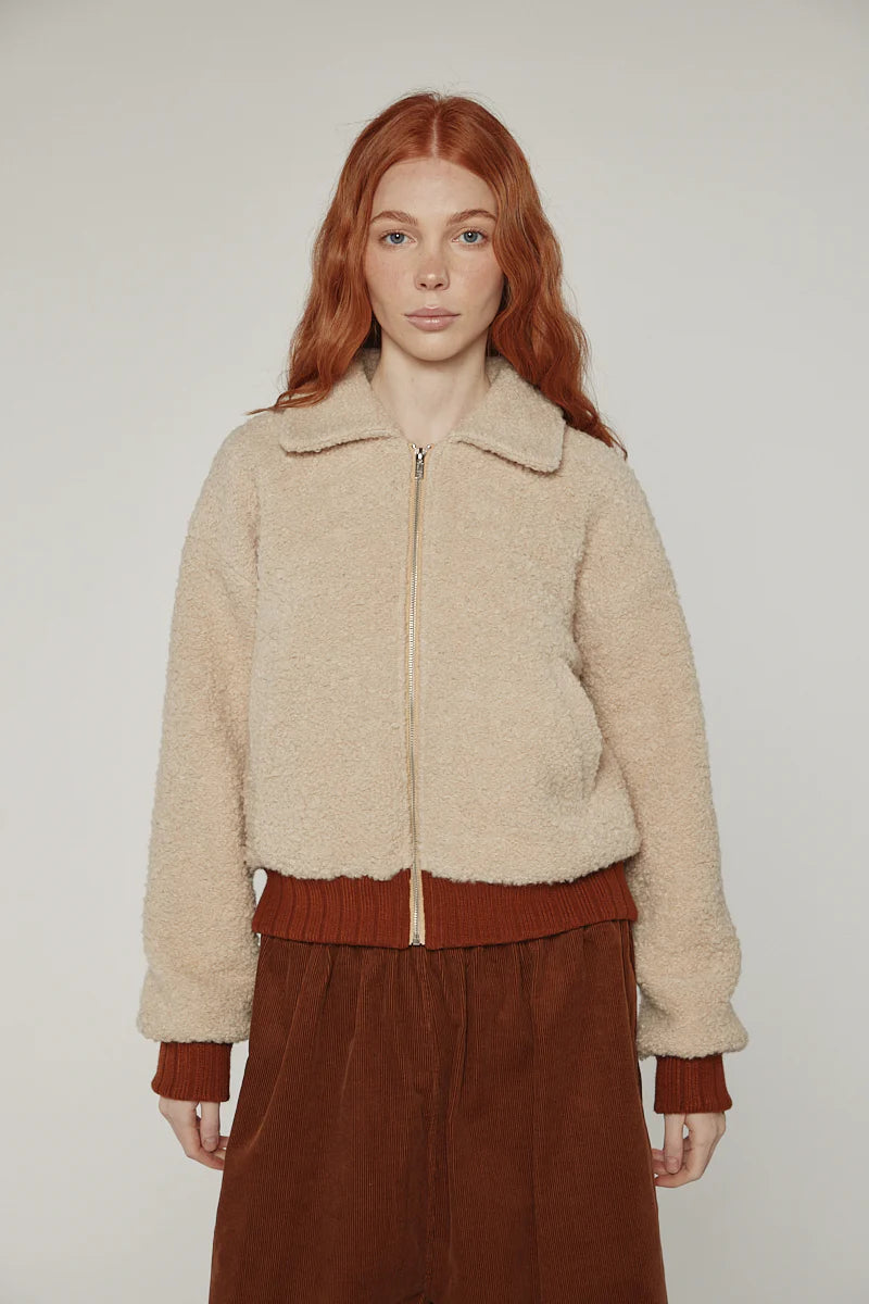 This bomber jacket puts a fresh spin on a timeless style. Made from a cozy wool blend, it features delicate ribbed accents on the cuffs, hem, and collar. Its sleek shape and comfy, relaxed fit make it your go-to jacket for those in-between seasons.