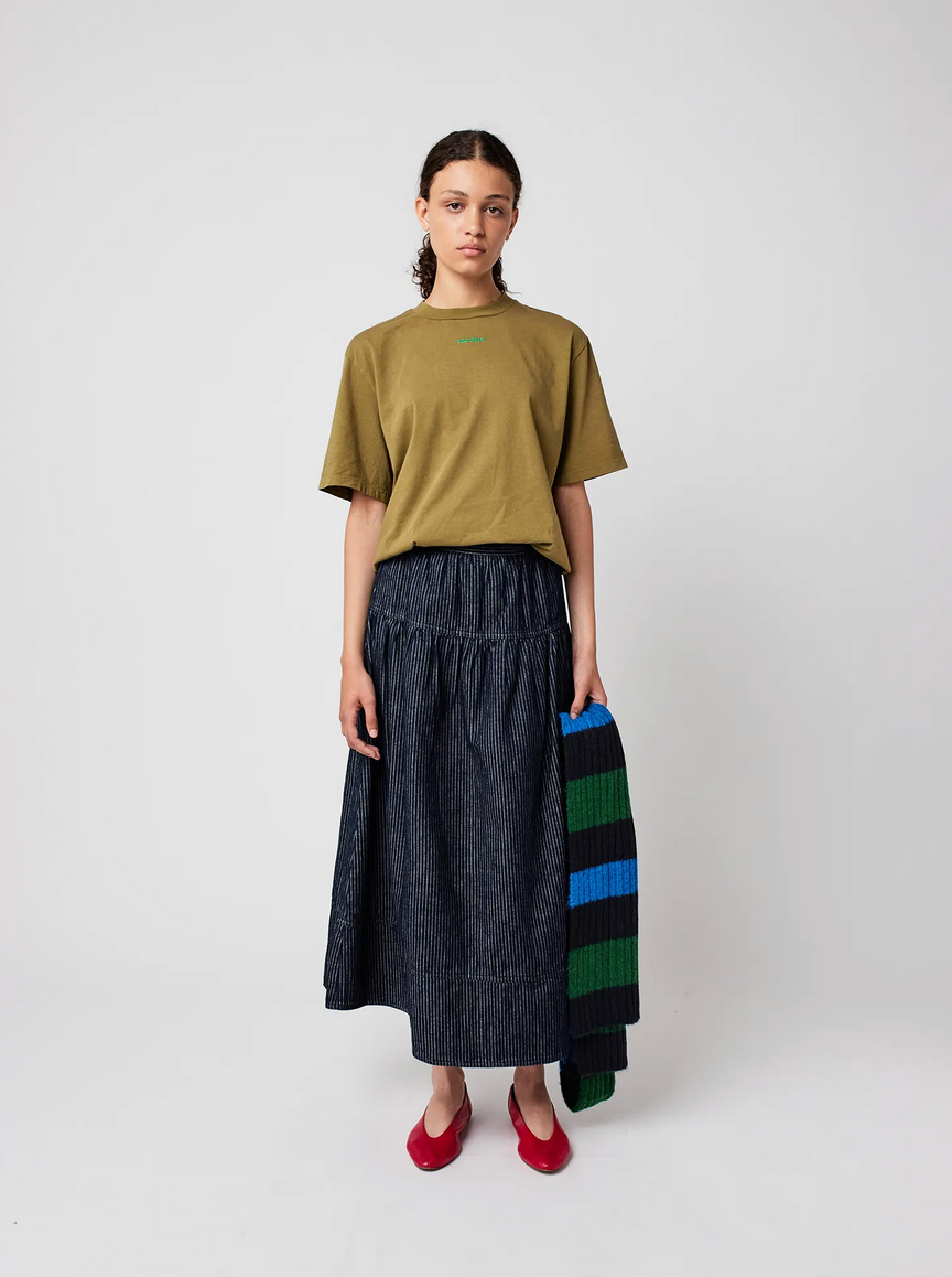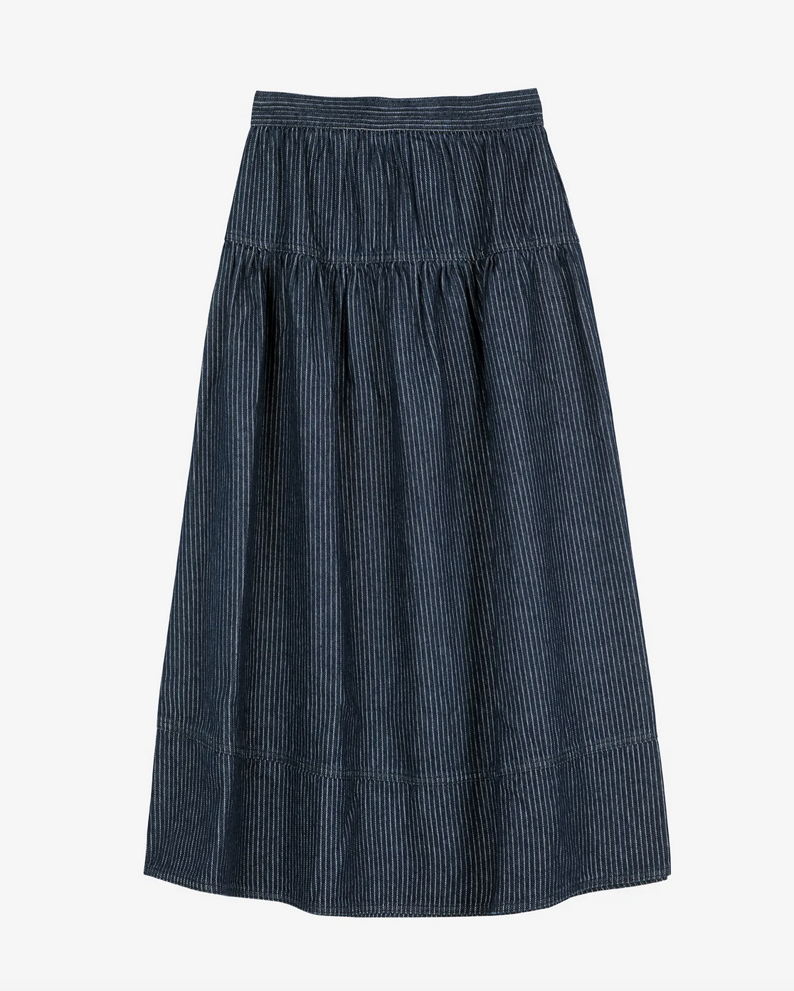 This playful midi-length denim skirt features a fun striped pattern and a flattering A-line shape—your new go-to closet essential!