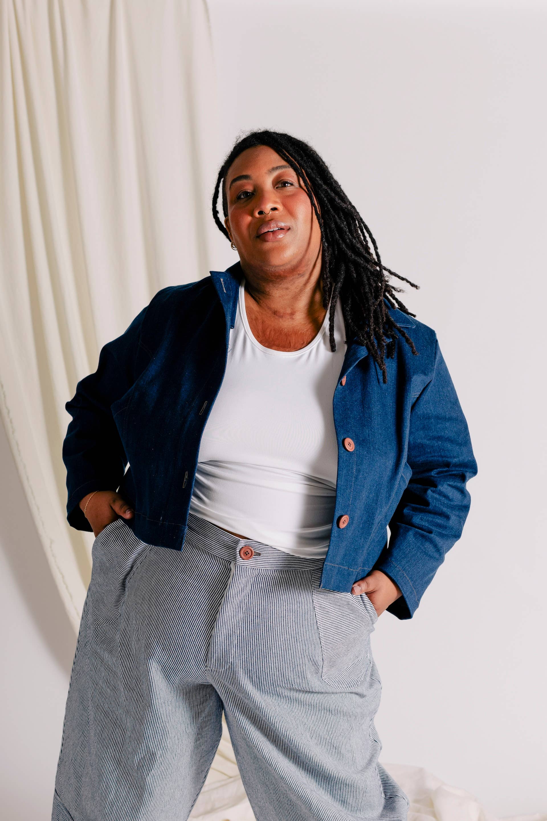 In cotton denim, the Leo is structured yet soft. Note that the Dark Denim is a heaver finish with a small amount of stretch, while the Ticking Stripe Denim is lighter with no stretch. We recommend the Dark Denim for cooler weather, while the Ticking Stripe Denim is more suitable for moderate temperatures.