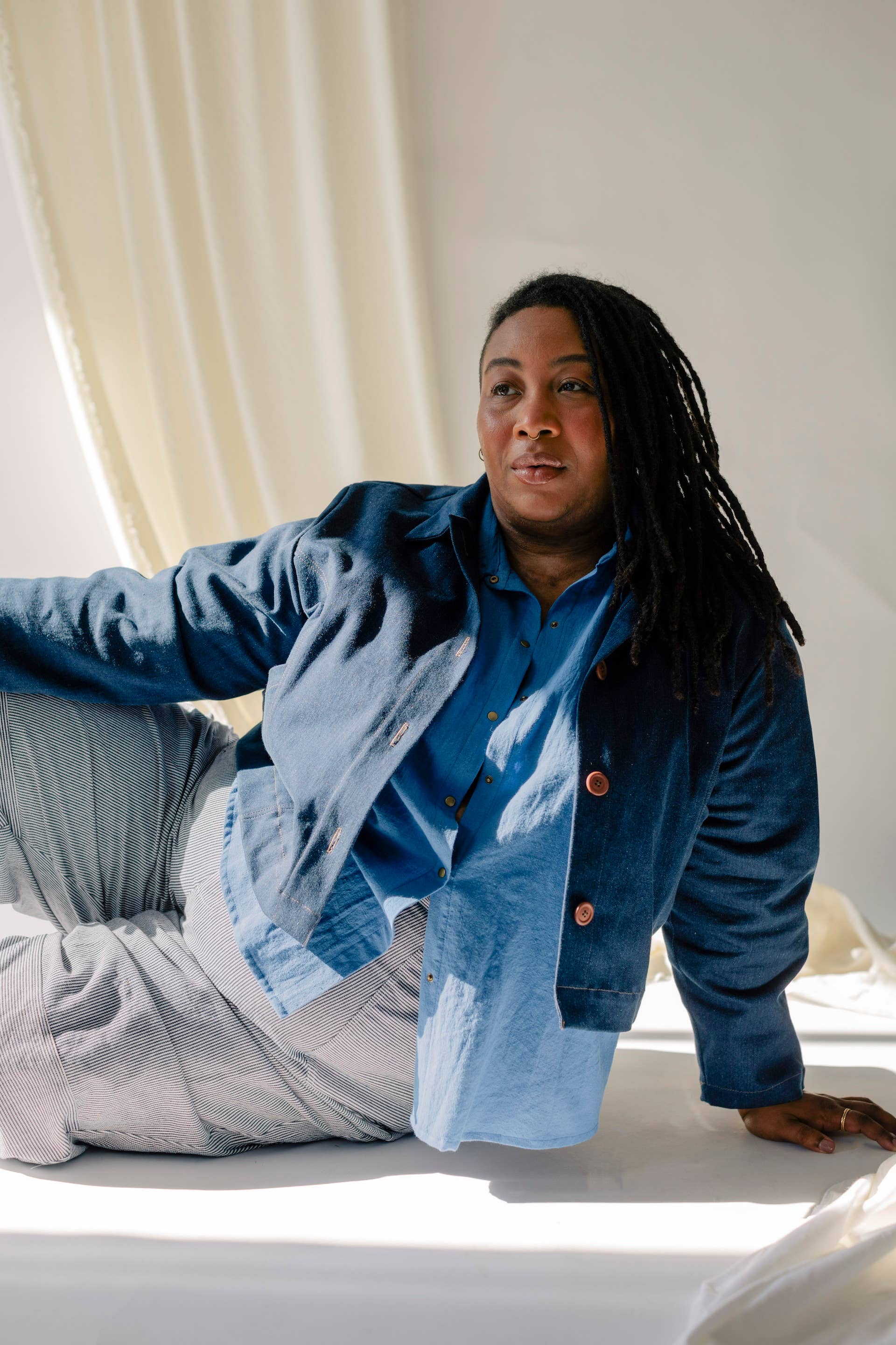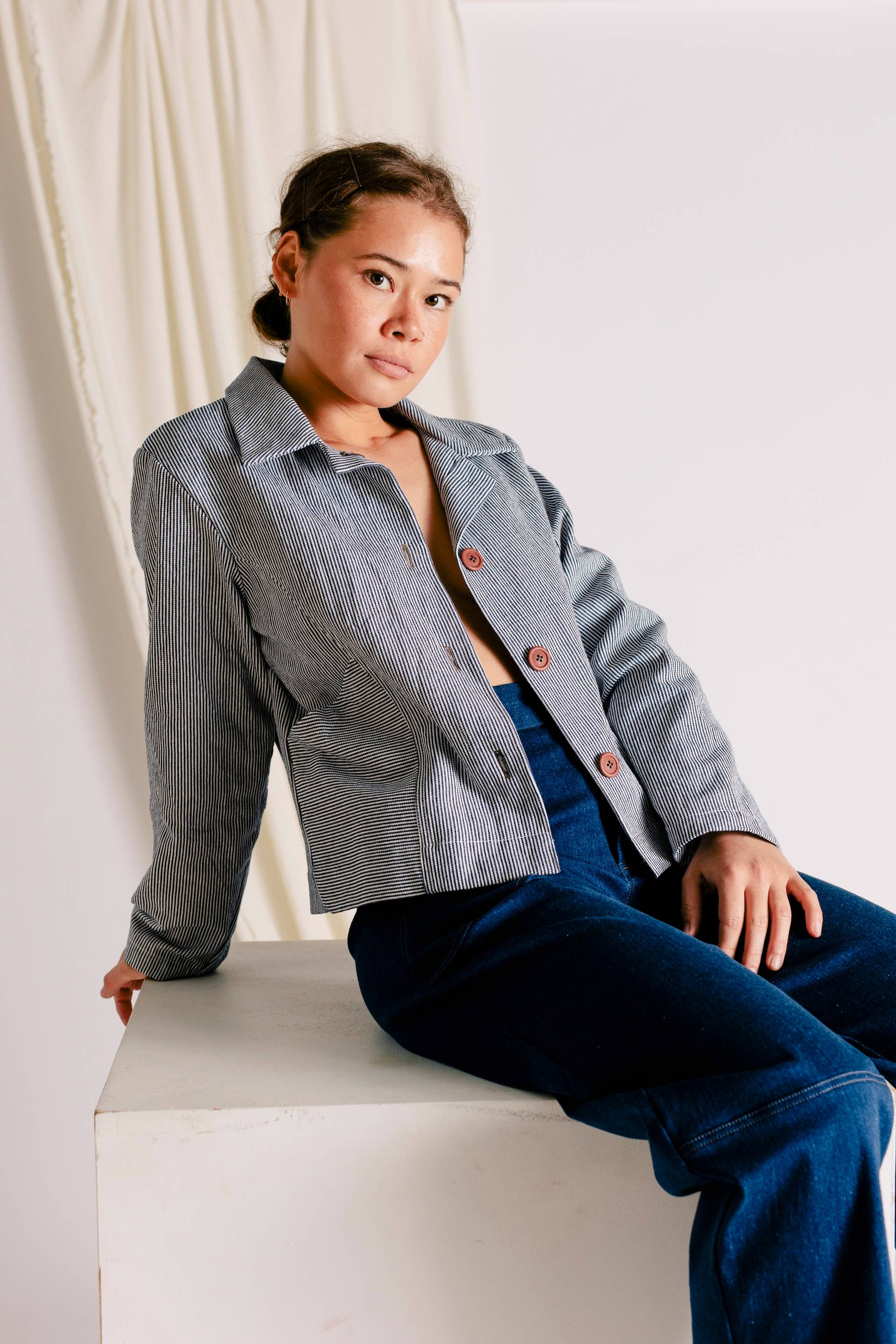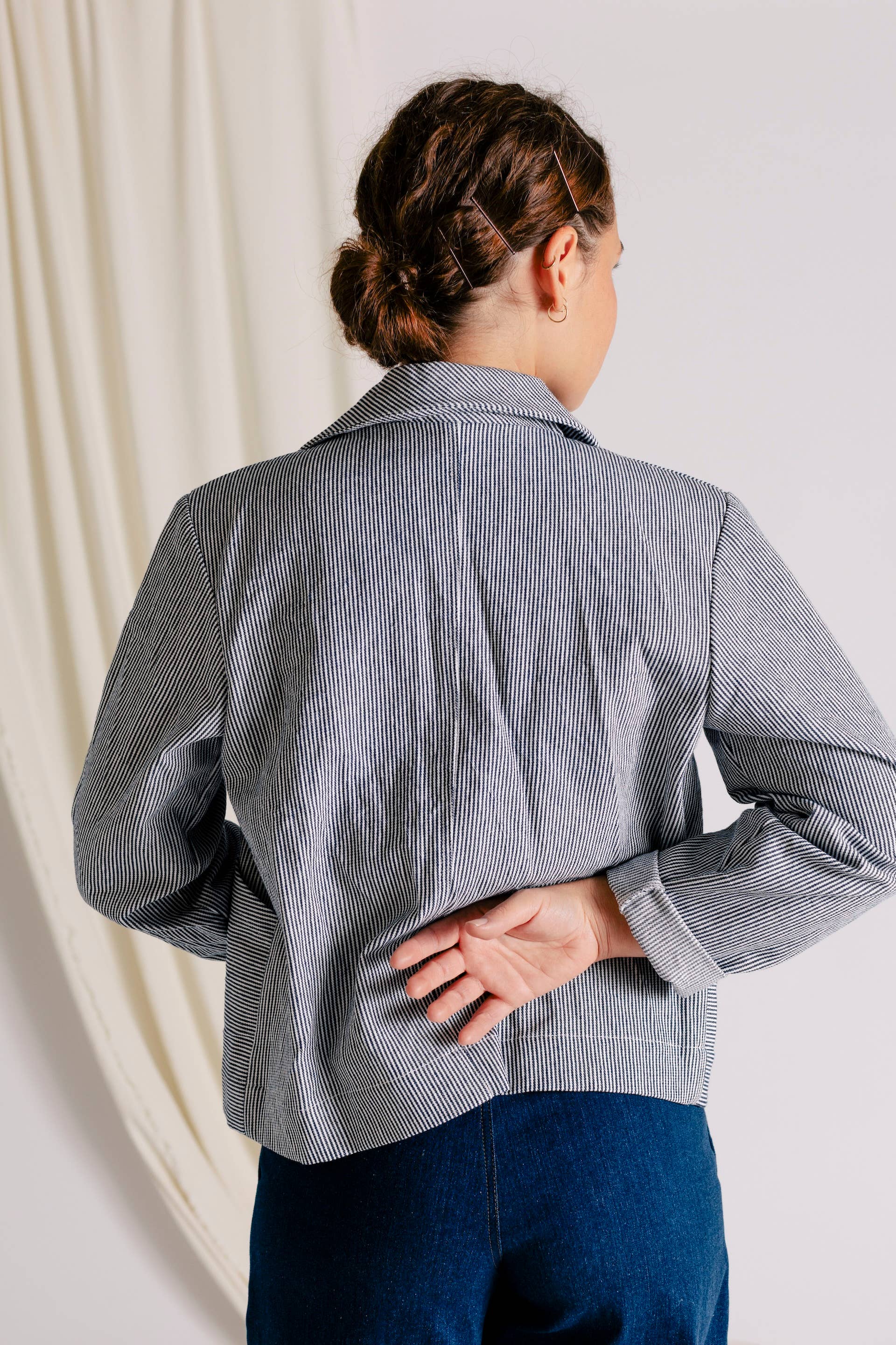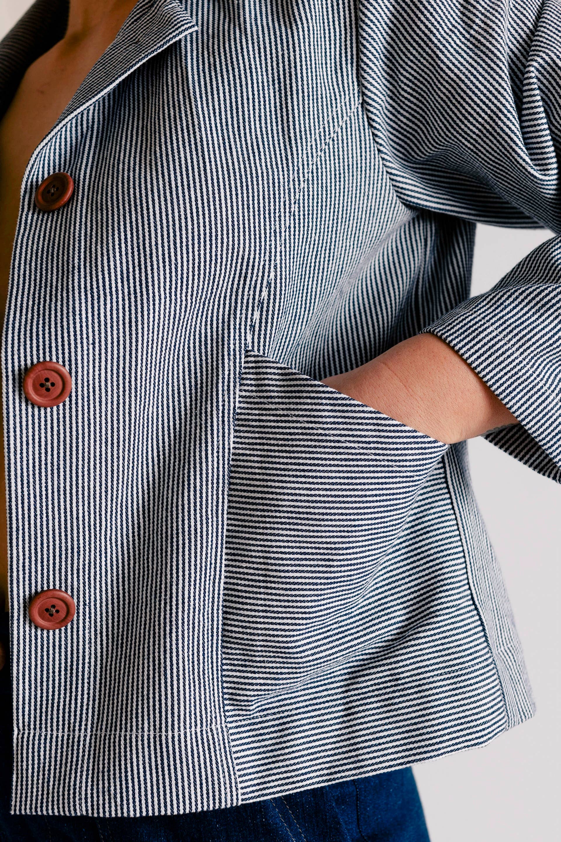 The Leo Chore Coat is a slightly cropped jacket with beautiful finishing details. The jacket is cut with a taper for a tailored feel, which compliments the bias-cut collar piece. Curved front seams allow for pieced in pockets placed at an angle to comfortably fit your hand or phone. Recycled hemp buttons anchor the silhouette.