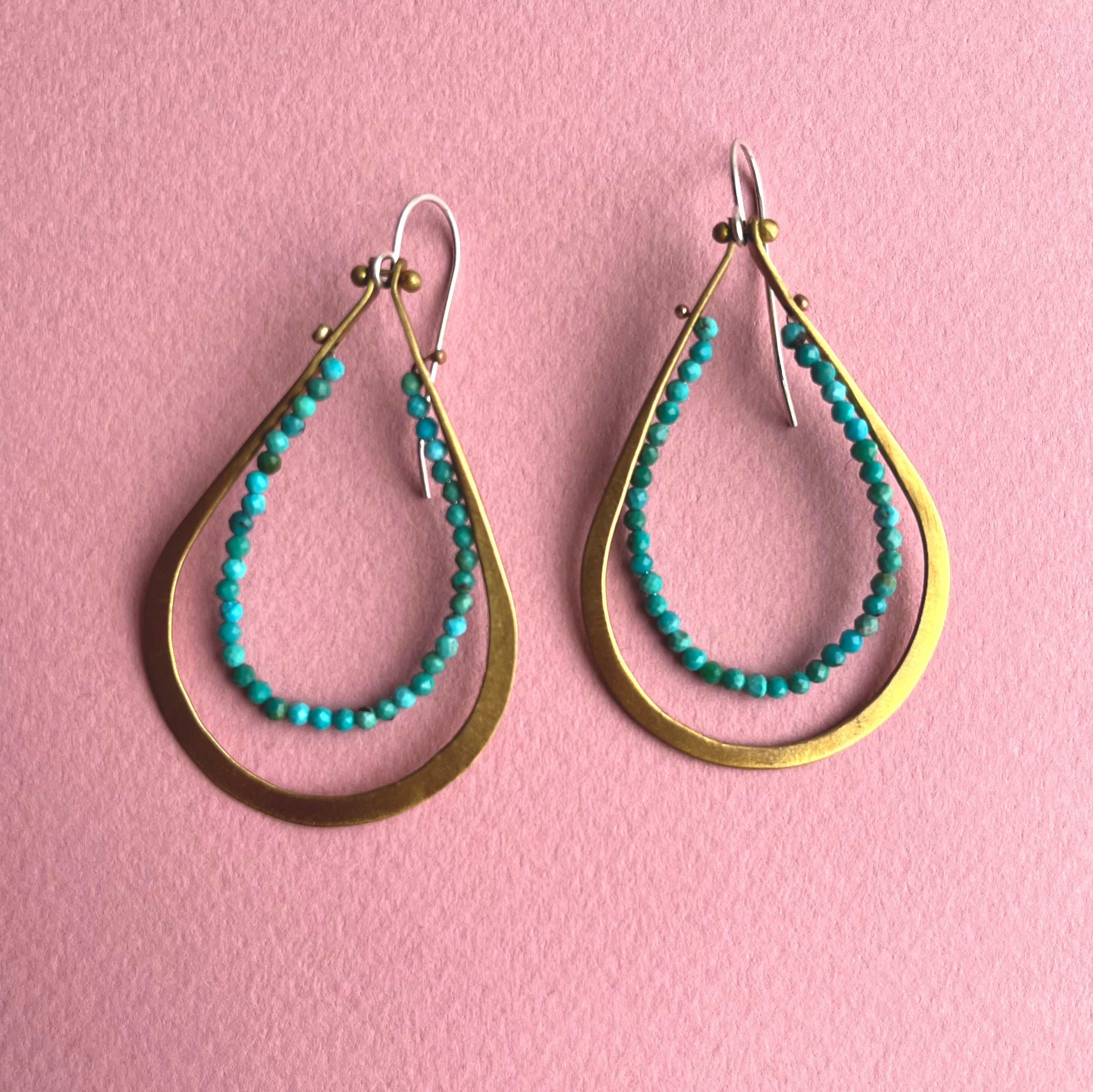 These playful earrings feature vibrant turquoise beads set in brass, hanging from shiny sterling silver hooks for a fun and stylish look.